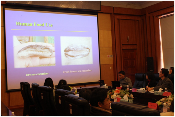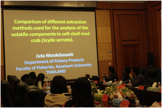 研讨会由牟海津副院长主持。首先,薛长湖院长介绍了我院的教学与科研情况,Suriyan Tunkijjanukij 院长介绍了泰国来访的教师和农业部官员。随后,泰国农业部水产部门官员Supakant Chaichotranunt先生作了题为:“泰国糙海参的养殖与繁育”的报告,黑料网 唐庆娟副教授作了题为:“海参活性成分与加工技术”的报告,泰国农业大学水产学院教师Juta Mookdasanit 博士作了题为:“不同提取方法对锯缘青蟹挥发性成分检测的影响比较”的报告。此次“中-泰”国际合作项目研讨会主要围绕海参的养殖及加工技术展开,整场研讨会气氛高涨,参会人员讨论热烈,食品学院师生均表示受益良多。此次研讨会为双方进一步深入交流与合作夯实了基础。(文/唐庆娟;图/武娟)