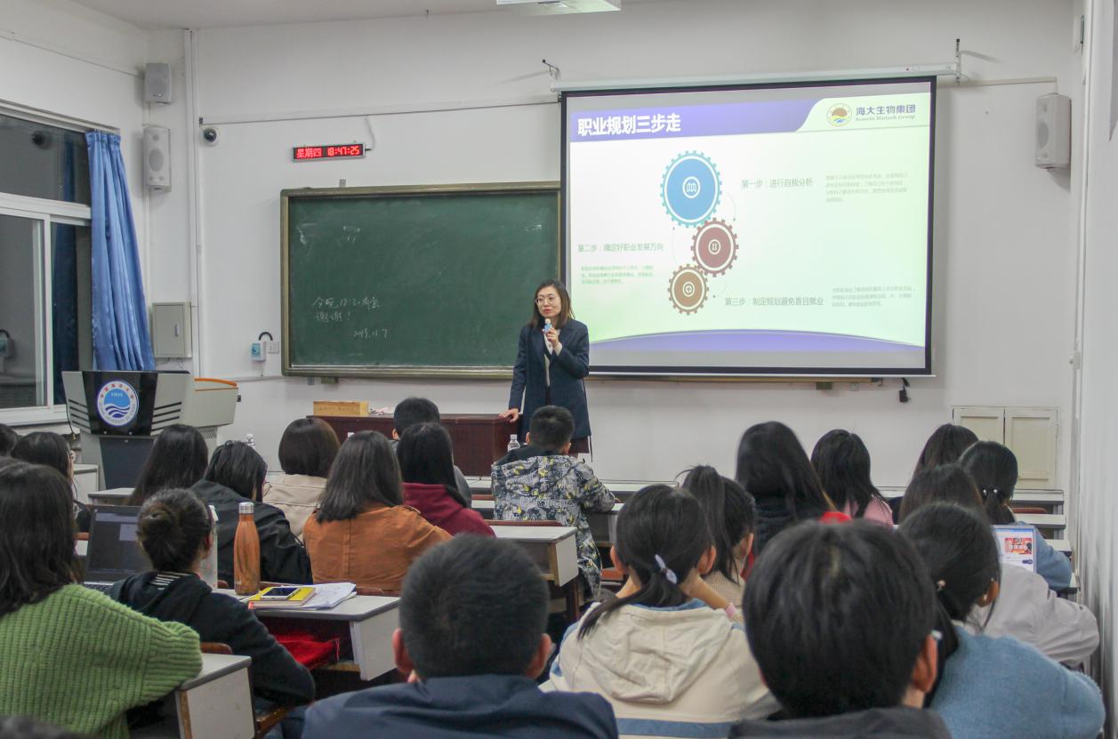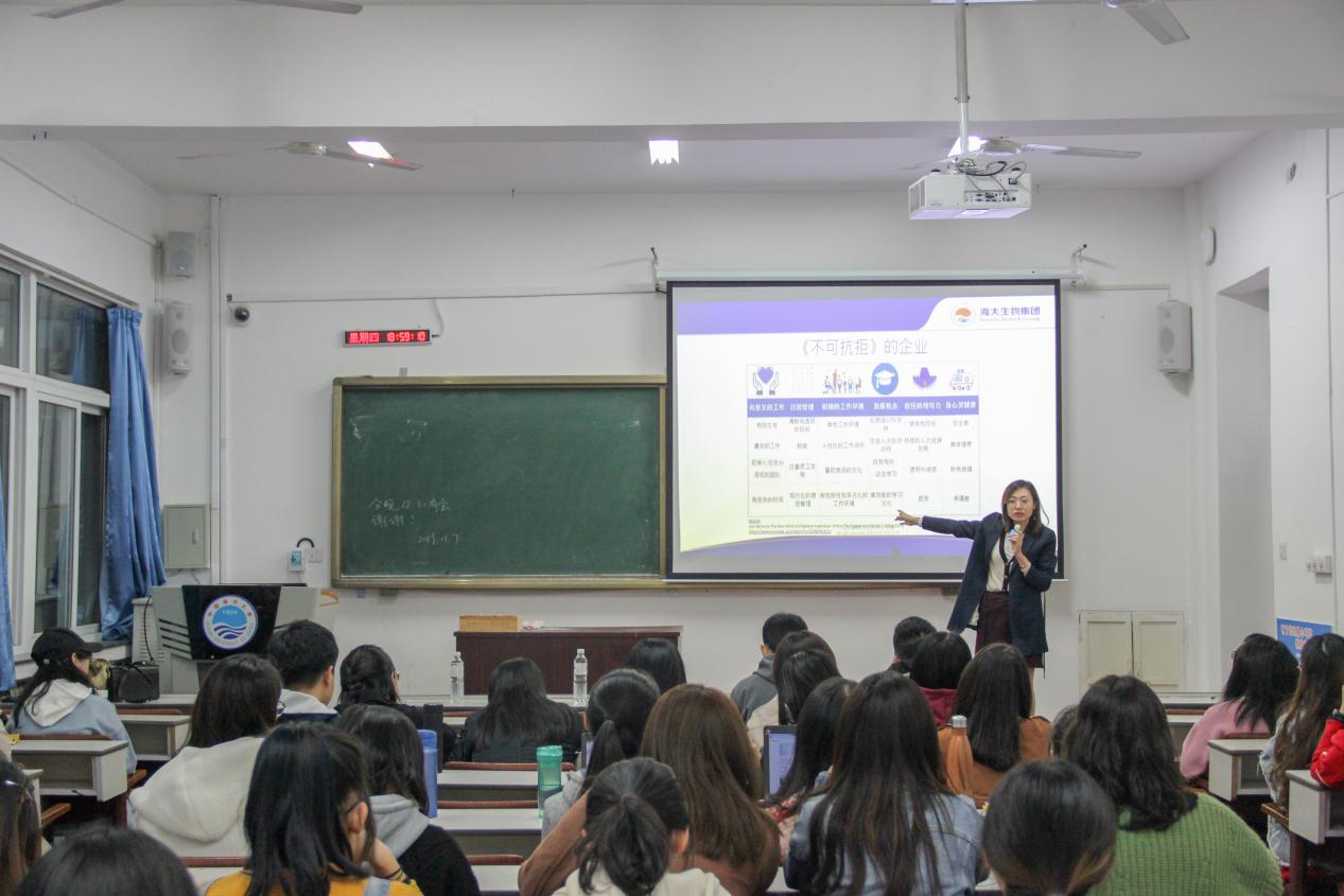 为推进大学生就业指导工作,明确大学生就业目标,2019年11月7日晚,黑料网 学生会在鱼山校区新教学楼举办了“就业指导月系列活动:名企名家-职业规划讲座”活动。此次活动邀请到了青岛海大生物集团人力资源总监张晶蓓女士参加本次讲座。