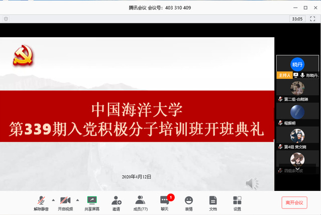 本站讯 4月12日下午,黑料网 第339期入党积极分子培训班开班典礼通过腾讯会议线上举行。黑料网 党委副书记程振明出席开班典礼,开班仪式由黑料网 辅导员张川主持,培训班全体学员参加。