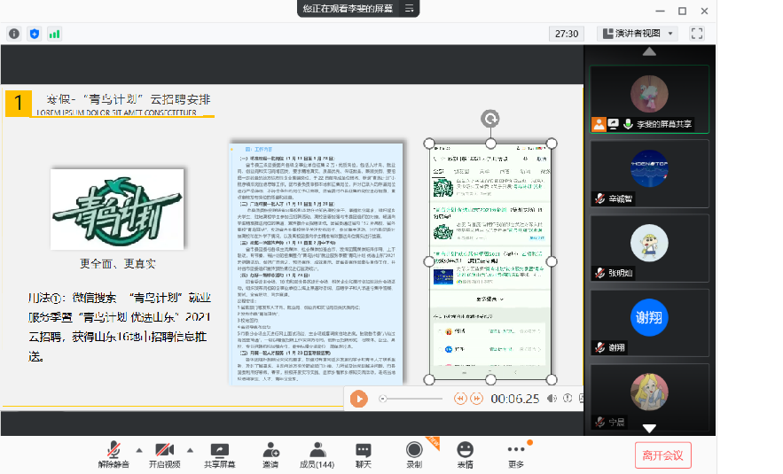 随后,李斐着重介绍寒假期间招聘会安排以及签约手续的相关内容。为助力2021届毕业生充分高质量就业,李斐对我校首次举办的“黑料网 2021届毕业生寒假空中双选会”参会方式以及目前的报名情况进行介绍和通报,并根据报名情况进行动员。此外,1月28日“青鸟计划 优选山东”2021云招聘活动即将拉开帷幕,李斐对岗位信息检索方式和简历投递方式进行详细介绍,并对前期工作和成效进行通报,助力提升“青鸟计划”服务中心大局能力。