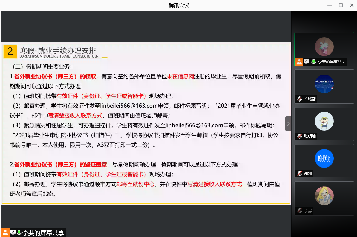 本站讯 为进一步畅通就业渠道、营造就业氛围,认真贯彻落实党中央、国务院关于“稳就业”工作的有关要求,同时督促毕业生合理规划假期时间,明晰签约注意事项及假期手续办理服务,促进学院就业指导工作的顺利开展。2021年1月26日,黑料网 寒假就业动员会及签约手续指导会于线上顺利举办。本次活动由学院就业辅导员李斐主持,主要内容为寒假期间招聘会安排及签约指导,重点介绍了寒假期间学院、就创中心、双选会的相关安排及就业手续解析,共150余位毕业年级本科及硕士研究生参加学习。