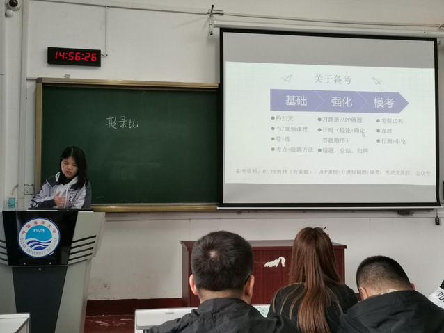 黄汉裕同学以“备考阶段时间管理和笔试指导”为主题进行考公分享,结合自身备考经验从基础、强化、模考三个环节提醒大家在备考环节注重要多练习多刷题,保持题感。建议采用计划表提高复习效率,利用各大公考APP进行模考,同时通过关注人民日报、新华社等与时事政治相关的公众号扩充知识面、增进对时政的了解。