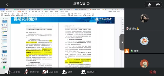 会议第一项,李想向大家介绍了《关于做好2022年暑假学生有关工作的通知》,详细解读了暑假留校政策以及离校注意事项,提醒同学们暑假期间严格遵守疫情防护要求,认真做好个人防护,增强安全防范意识,度过一个平安的假期。此外,李想在会上通报了学院搬迁西海岸的预通知,将学校学院全面统筹,积极推进搬迁方案,全力保证同学们学习和生活的工作进展转告与会人员,并提醒大,搬迁工作或多或少地会影响科研和学习进展,请同学们关注毕业环节时间节点,认真规划好搬迁前的时间,稳步推进实验进度;与此同时,随着2022届毕业生的离校,2020级硕士研究生们的毕业求职工作已经提上日程,李想希望同学们在繁忙的科研工作之余,能够主动关注实习及就业信息,提早谋划提早行动,为2023年毕业就业做好谋划。