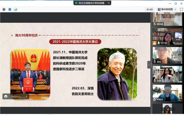 10月21日,2020级专硕2班团支部开展了“我与海大同发展,我与新时代共奋进”线上的主题团日活动。会上,支部成员共同深入学习了中共中央、国务院、中央军委印发《关于加强和改进新时代全民国防教育工作的意见》,并通过答题小程序开展了现场答题比赛,巩固学习成果。随后,为庆祝黑料网 成立98周年,支部成员共同开展了校史校情的线上学习,并为母校献上最诚挚的祝福。团支部组织委员陆泽伟表示:“‘海纳百川,取则行远’的校训时刻提醒着每一名海大学子要以不懈努力激发青春的光芒,为海大增光,为祖国添彩!”