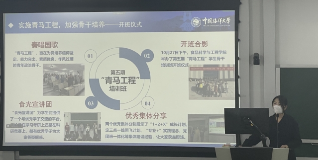 2020级海洋资源开发技术班邢博妍作为优秀学员代表发言,她按照时间线带领大家共同回归了本期“青马工程”培训班。邢博妍表示,通过本次培训班她意识到,学生干部首先是学生,其次才是干部,既要夯实专业基础,又要提升个人能力与修养,做好模范带头作用。
