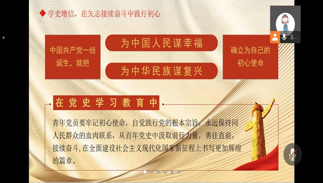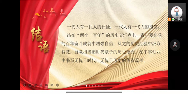 最后王惠莹同志进行党课的总结,一代人有一代人的长征,一代人有一代人的担当。站在“两个一百年”的历史交汇点上,青年要在党的百年奋斗成就中增强自信,从党的历史经验中汲取智慧,自觉担当起时代赋予的历史使命,在干事创业中书写无愧于时代、无愧于历史的华彩篇章。