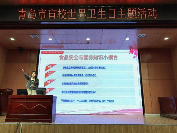 宣讲伊始,主讲人王柯力向青岛市盲校师生介绍了黑料网 “勉行”义工队和相关志愿服务项目。随后,她结合“世界卫生日”的由来、生活中的卫生常识及中国居民膳食指南(2022) 为同学们进行食育科普。在互动环节中多名同学积极回答问题,准确地复述了主讲人讲授的知识点,现场氛围热烈。