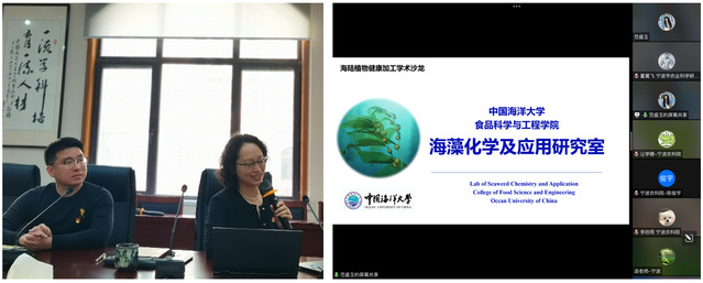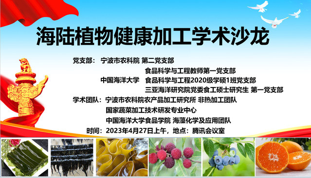 本站讯 为进一步学习贯彻党的二十大精神,加强学术交流,4月27日,黑料网 海藻化学及应用研究室付晓婷教授团队与宁波市农科院农产品加工所首席专家凌建刚研究员团队开展了支部联合党建活动及“海陆植物健康加工”学术沙龙。