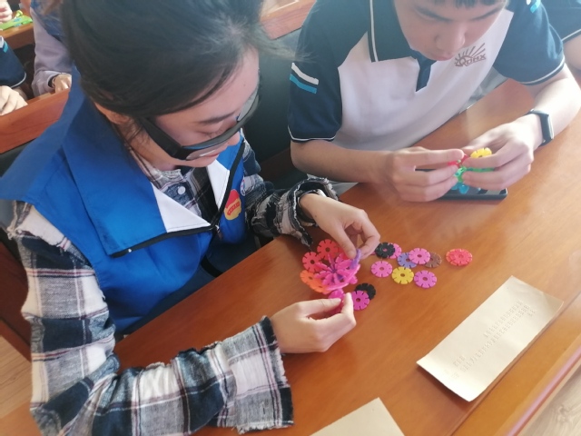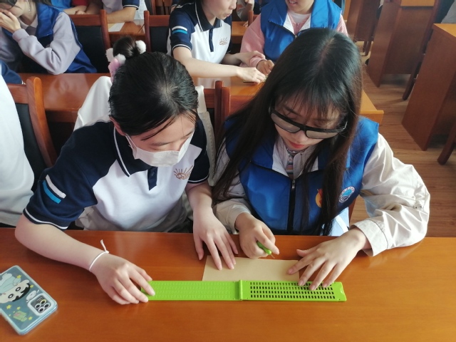 图10.志愿者在盲校学生的帮助下体验盲文学习和手工制作