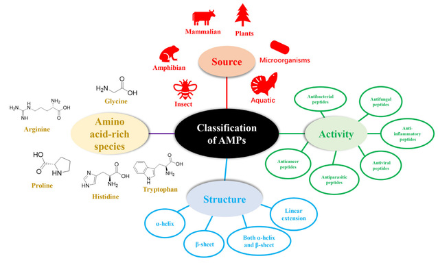 亚历山大·弗莱明于1922年发现了溶菌酶,这一发现标志着现代先天免疫的诞生。从那时起,抗生素和抗菌肽(AMPs)就被发现了。在抗菌肽数据库(APD3,//aps.unmc.edu/AP/)中已收录3000多种抗菌肽。不同类型的AMPs具有以下共性:氨基酸残基数量在10到60之间(平均:33.26),并且几乎所有的AMPs都是阳离子的(平均净电荷:3.32)。然而,也存在几种阴离子AMPs。AMPs的构象以α-螺旋、β-折叠、延伸线性结构为主。此外,氨基酸组成、疏水性和两亲性是AMPs的主要性能参数。