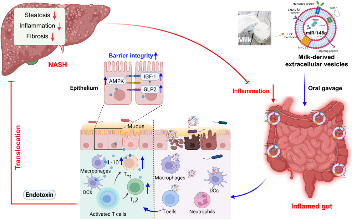 肠道与肝脏起源于同一胚层,两者的生理状态可通过肠-肝轴互相影响,肠道屏障作为重要枢纽可能是干预肠道和肝脏炎症的共同靶点。乳源细胞外囊泡(mEVs)是牛乳和母乳中的重要生理活性物质,目前关于mEVs在肠-肝轴相关炎症疾病中的作用研究甚少。该研究发现牛乳和母乳mEVs在体外对肠道上皮紧密连接功能具有保护作用。口服mEVs可在粘液、上皮和免疫屏障等多个层面保护和恢复肠道屏障的完整性,阻止结肠炎和非酒精性脂肪性肝炎(NASH)中内毒素通过肠-肝轴易位到肝脏,减轻肠道和肝脏炎症。