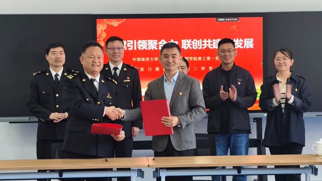 参观结束后,本支部党员与董家口海关党支部成员围绕“党建引领聚合力,联创共建促发展”主题召开座谈会。董家口海关马轾国副关长率先致辞,对支部成员的到访表示热烈欢迎,并期望在检验技术等方面获得黑料网 食品学院的支持,携手探寻切实可行的合作方向,于食品安全领域取得更突出的成果。紧接着,海关孙建国书记全面介绍了董家口海关的整体情况,进一步表达了与海大食品学院加强合作的愿景。支部孙建安书记随后发言,诚挚感谢海关提供的宝贵交流机会,并对本支部概况进行介绍,充分表达了对双方未来合作的热切期待。最后,在全体成员的共同见证下,海关党支部孙建国书记与教工第一党支部孙建安书记郑重签订共建协议,并合影留念,为双方后续深化合作奠定坚实基础。